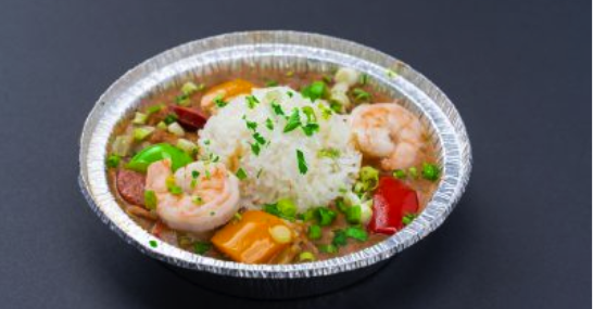Our Gumbo is a traditional Creole soup with shrimp, hot links and vegetables served with a scoop of rice.